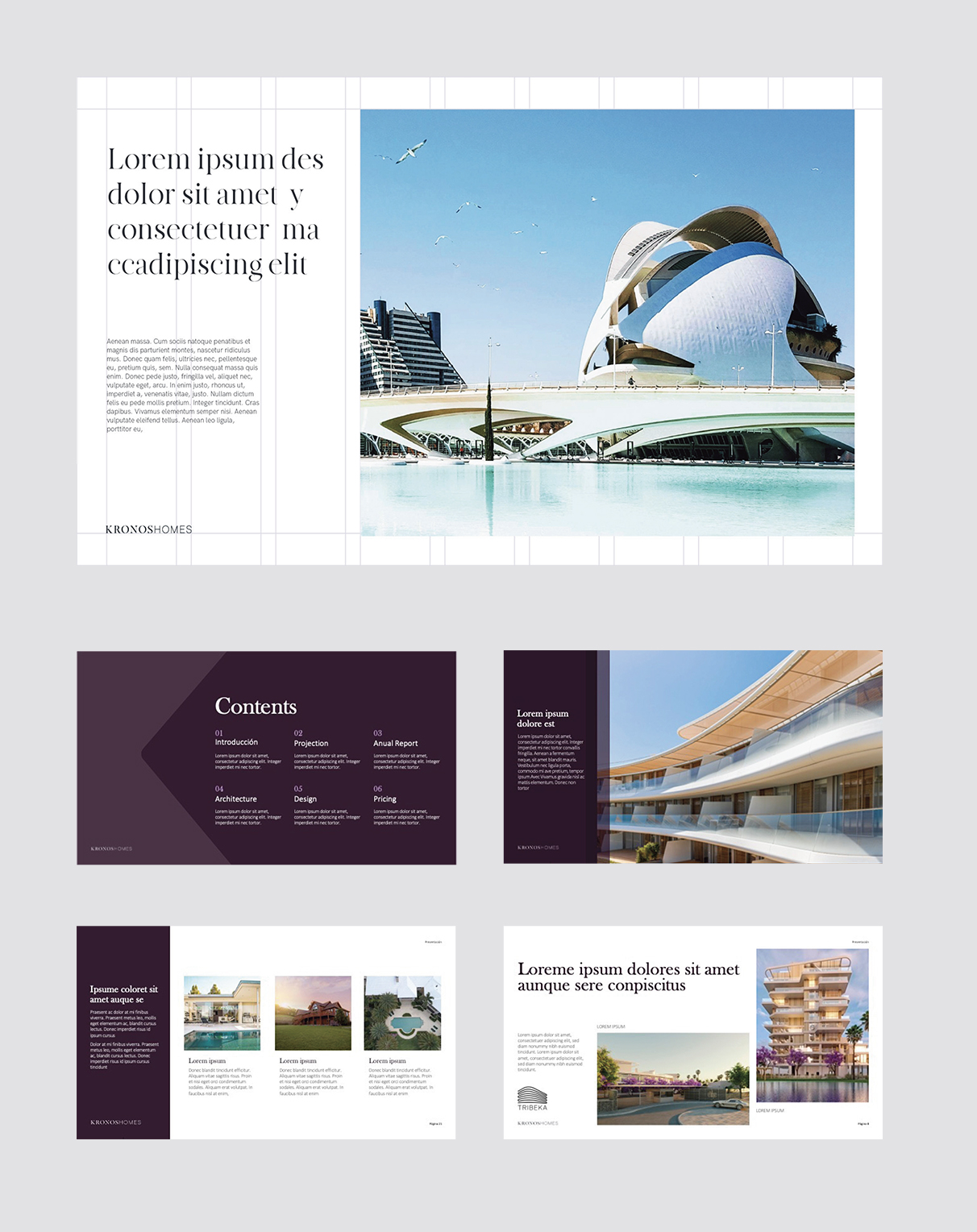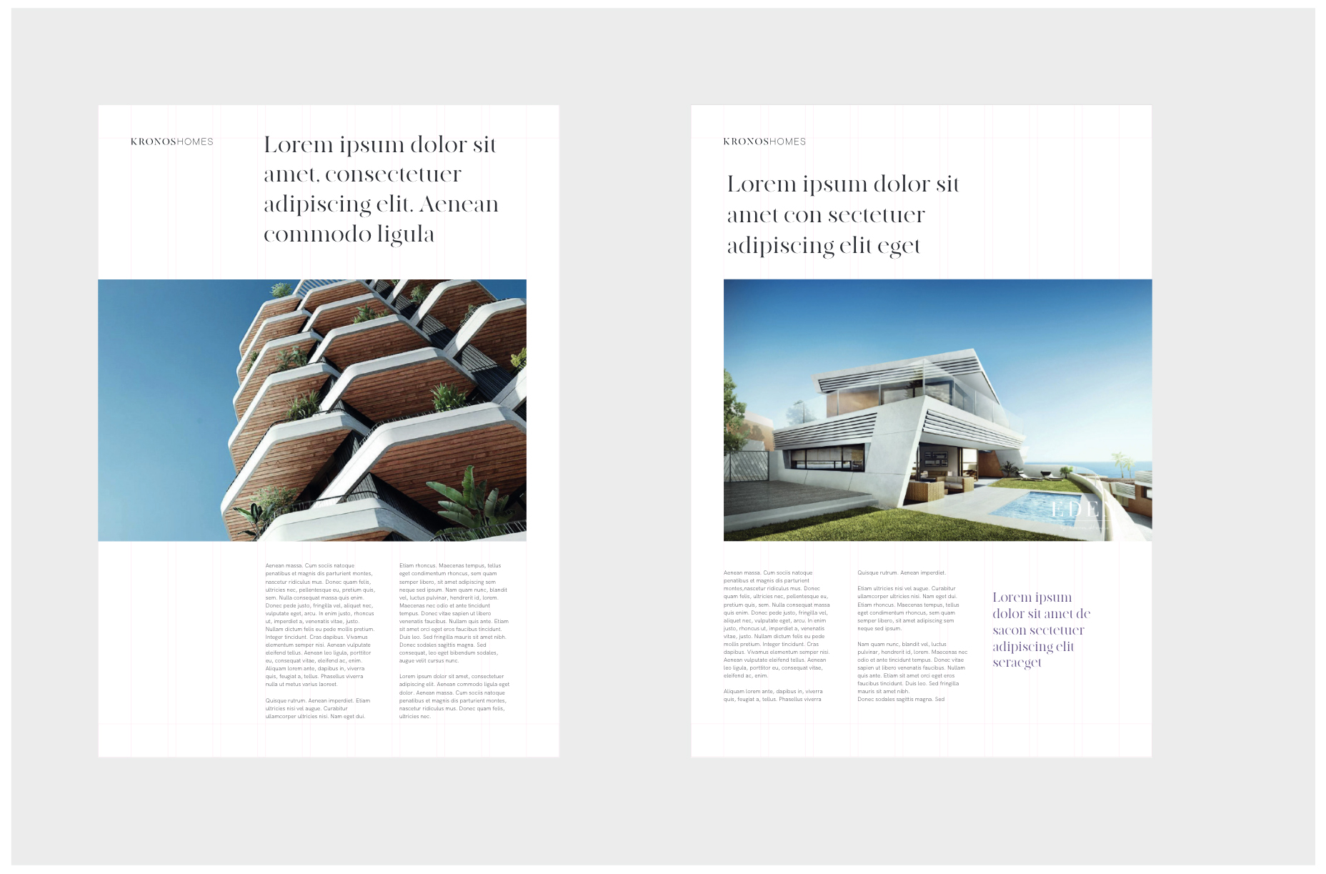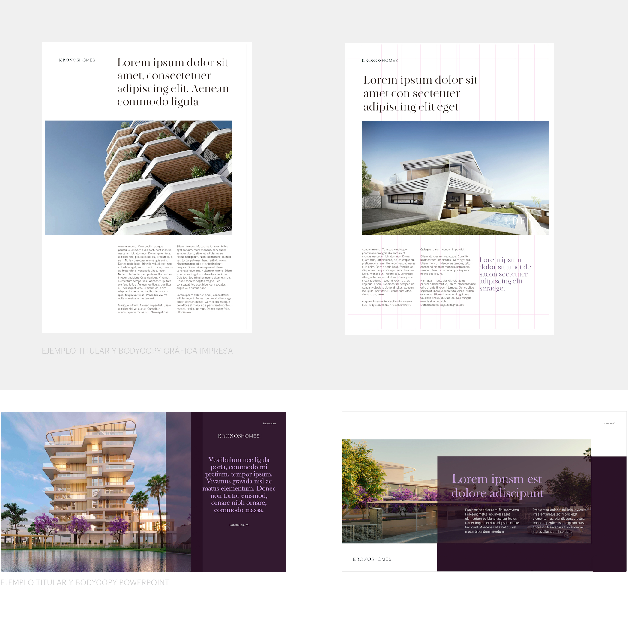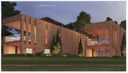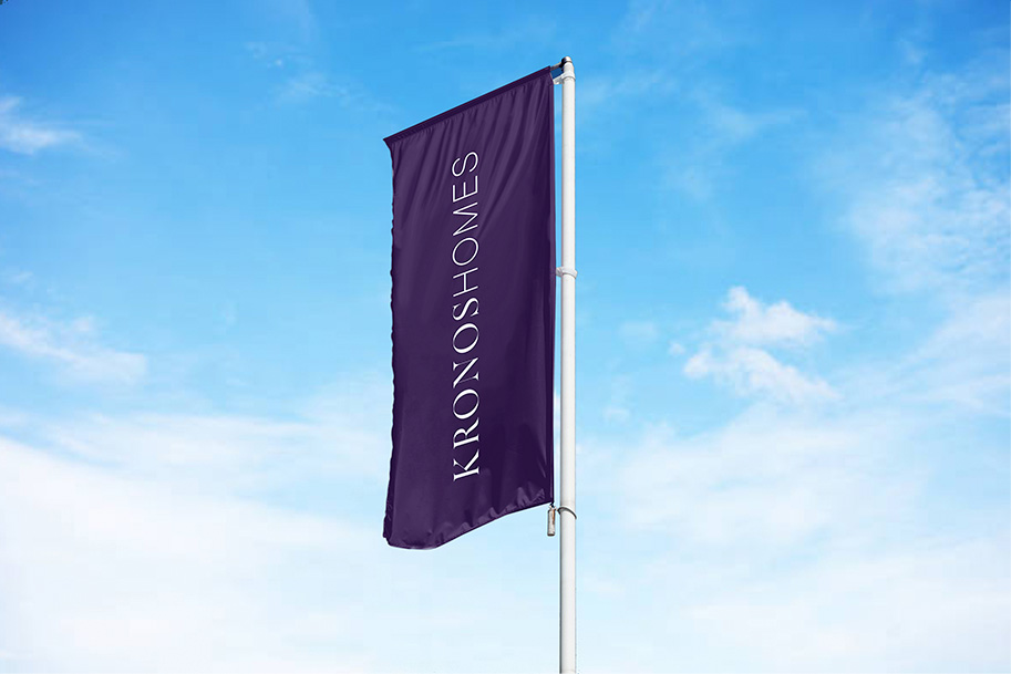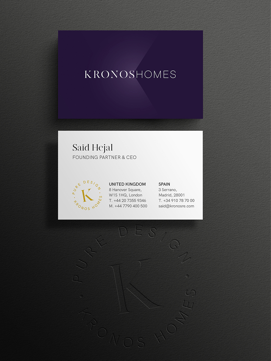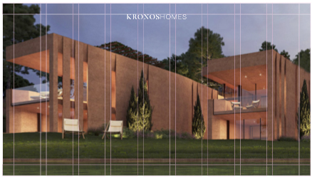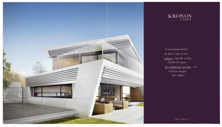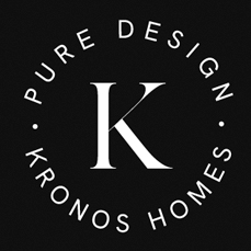 El logotipo de Kronos Homes se construye a partir de la tipografía Made Canvas Regular en caja alta y la tipografía Chalet Paris Nineteen Eighty que es light, en caja alta también. «Kronos» tiene un peso mayor que «Homes». La mezcla de una tipografía con serifa y otra sin serifa y muy light, dota de personalidad a la marca.